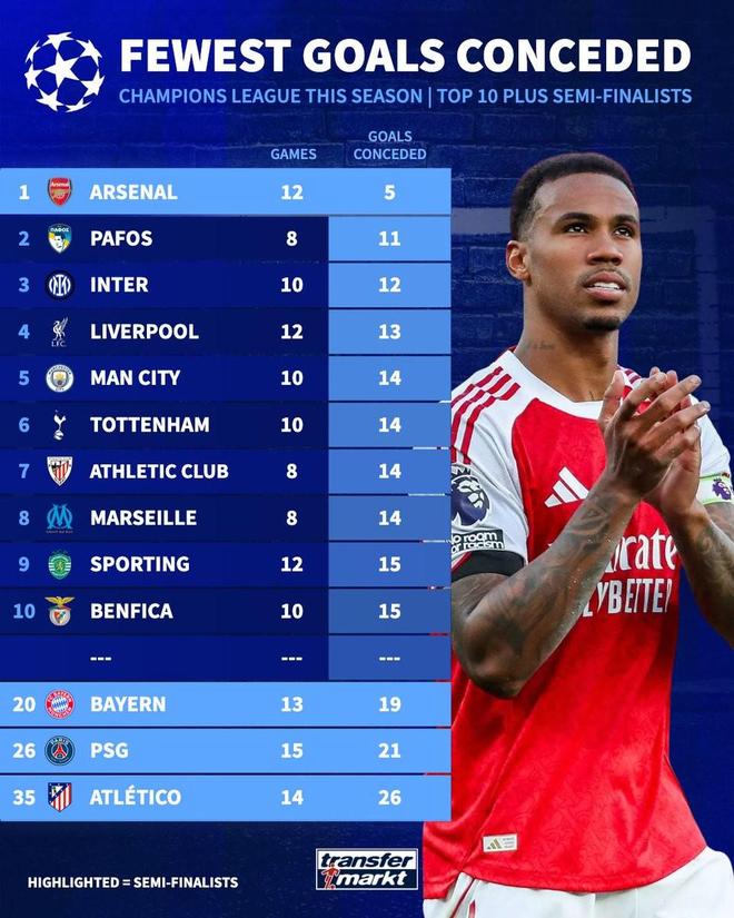 欧冠半决赛阿森纳对阵马竞比赛即将打响,赛前德转盘点了本赛季至今欧冠丢球数量的榜单,其中阿森纳12场比赛仅丢5球高居榜首。