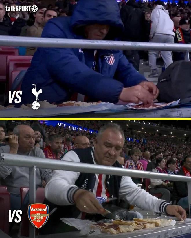 在本赛季欧冠1/8决赛中,马竞与热刺有过交锋。在首回合马竞5-2大胜热刺的比赛中,一名马竞球迷在看台上悠然制作三明治,引发球迷们的关注。