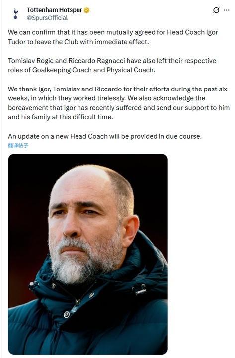 热刺官方写道:“感谢3人在过去六周的辛勤付出。我们也深知图多尔近期遭遇的丧亲之痛,并在此艰难时刻向他和他的家人致以慰问。关于新任主教练的任命,将在适当时候公布。”